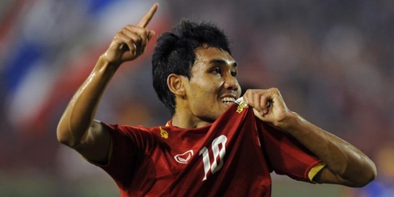 tim nasional Thailand, Teerasil Dangda, usai mencetak gol ke gawang